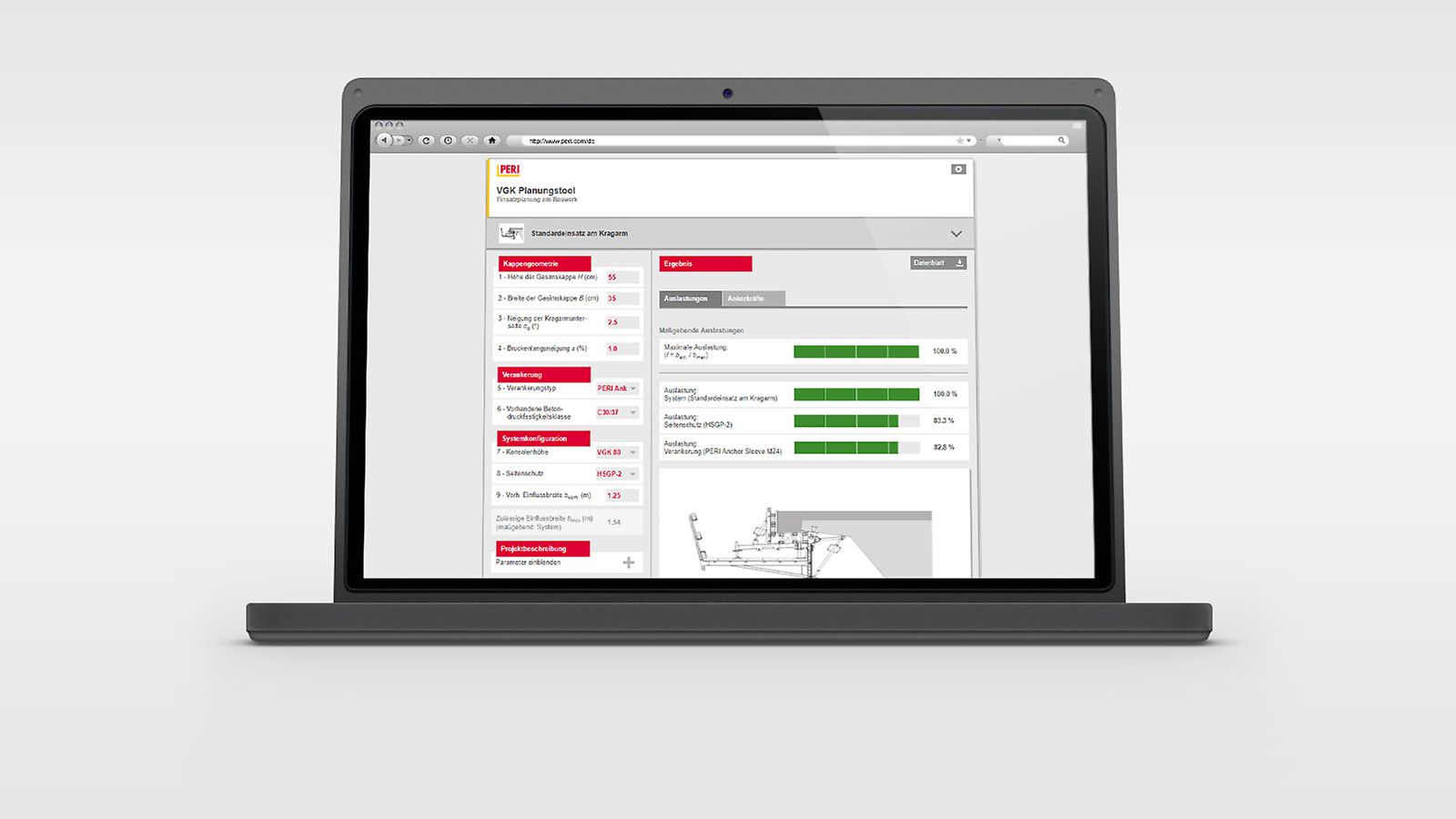 Il VGK Konsolystem Configurator ti supporta nel calcolo rapido, semplice e preciso della larghezza di influenza consentita delle staffe dei parapetti VGK per le esigenze individuali del tuo progetto. Inoltre, le forze di ancoraggio risultanti sono specificate in modo che possano essere utilizzate nel prossimo corso del progetto. La capacità portante dell'ancoraggio selezionato in condizioni di contorno, in conformità con l'approvazione, è già stata presa in considerazione.
